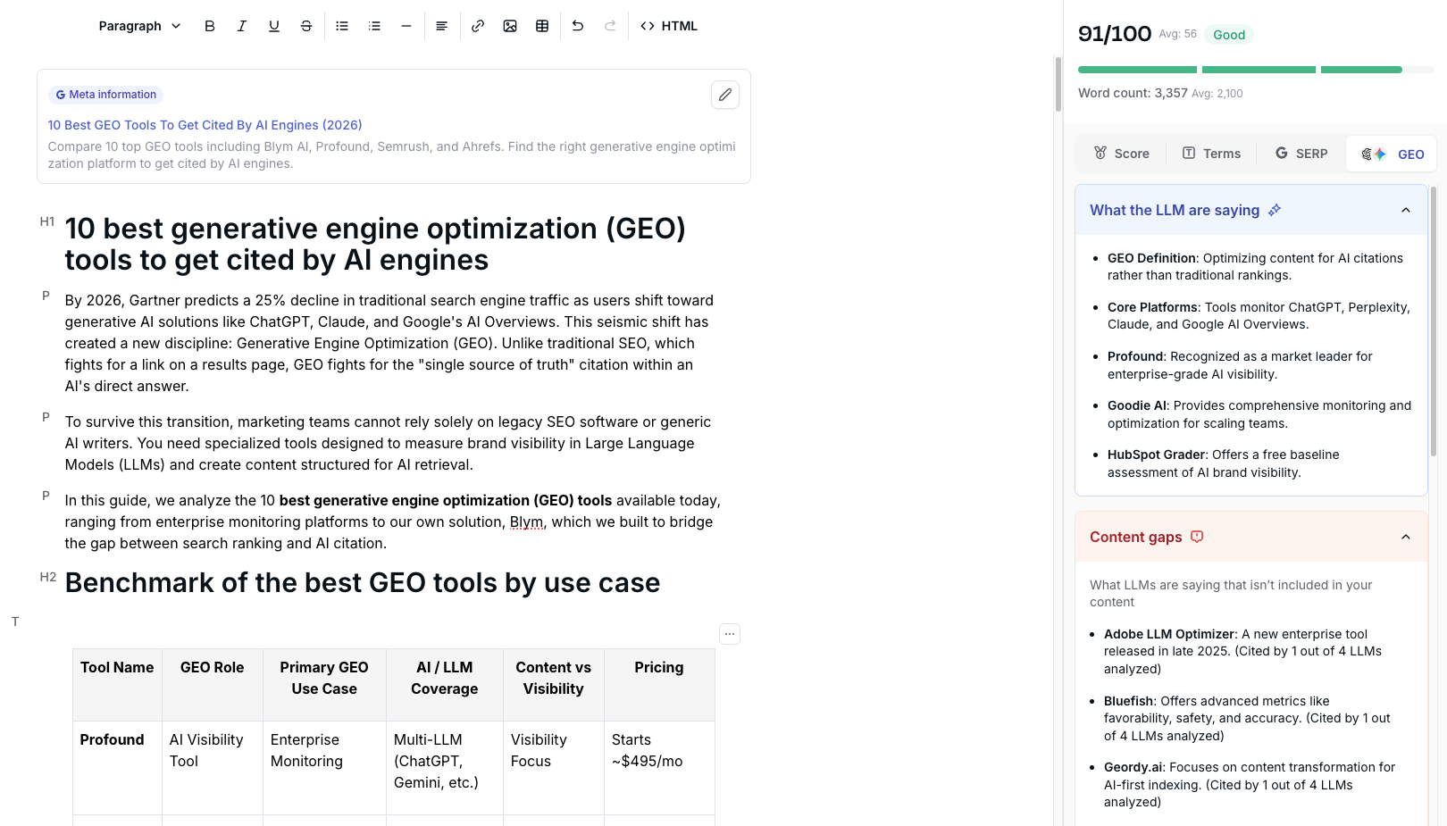 - Accepting heavy editing workloads: Many teams choose cheap AI tools only to spend hours rewriting the output. A true GEO platform should deliver publish-ready content. Blym's proprietary engine is designed to minimize the editing burden while maximizing strategic input.