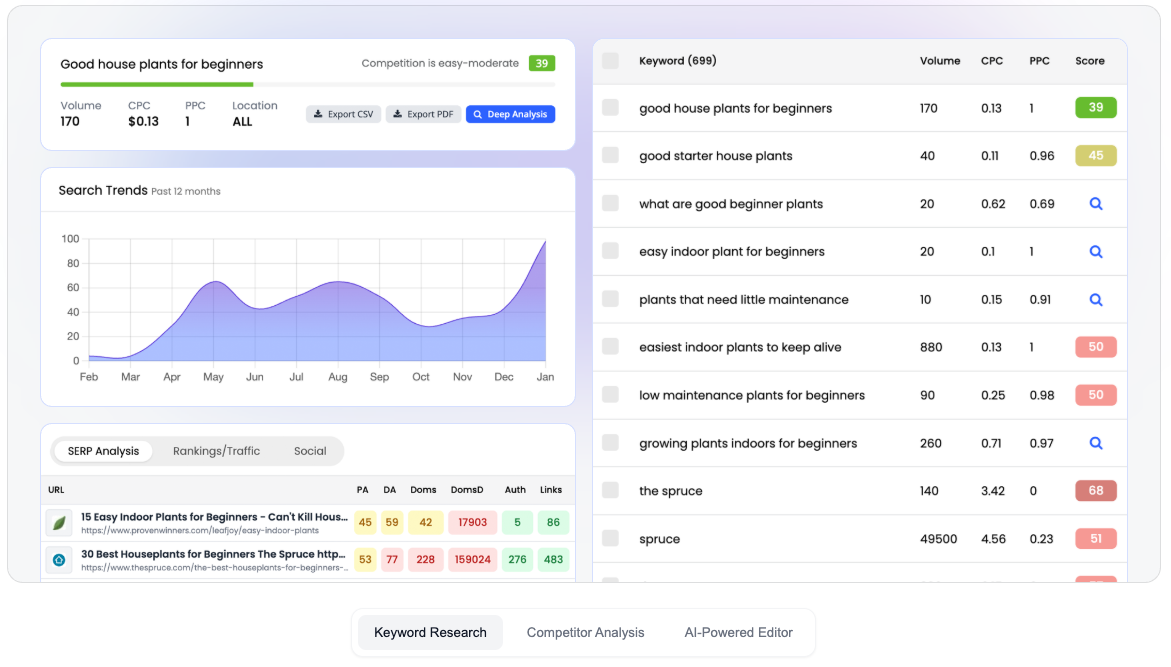 - Automated SERP analysis: Instantly processes top results to inform strategy.
