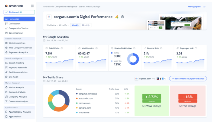 My review: Similarweb is excellent for quick competitive and market insights—especially with its free browser extension but once you move beyond surface-level analysis, the paid plans get expensive fast.